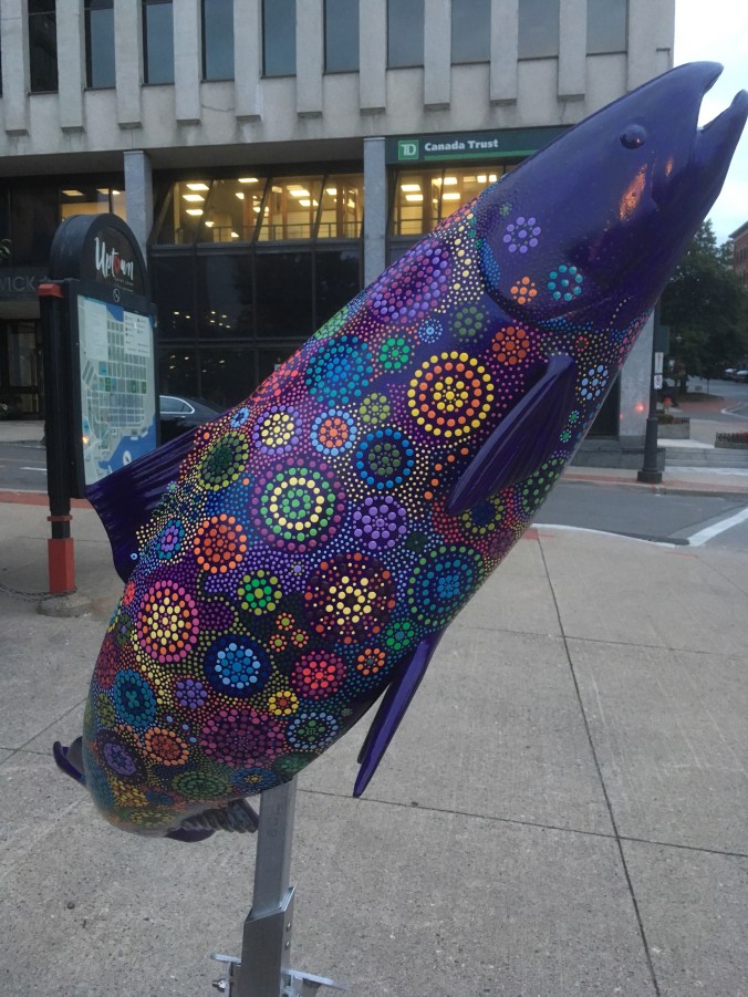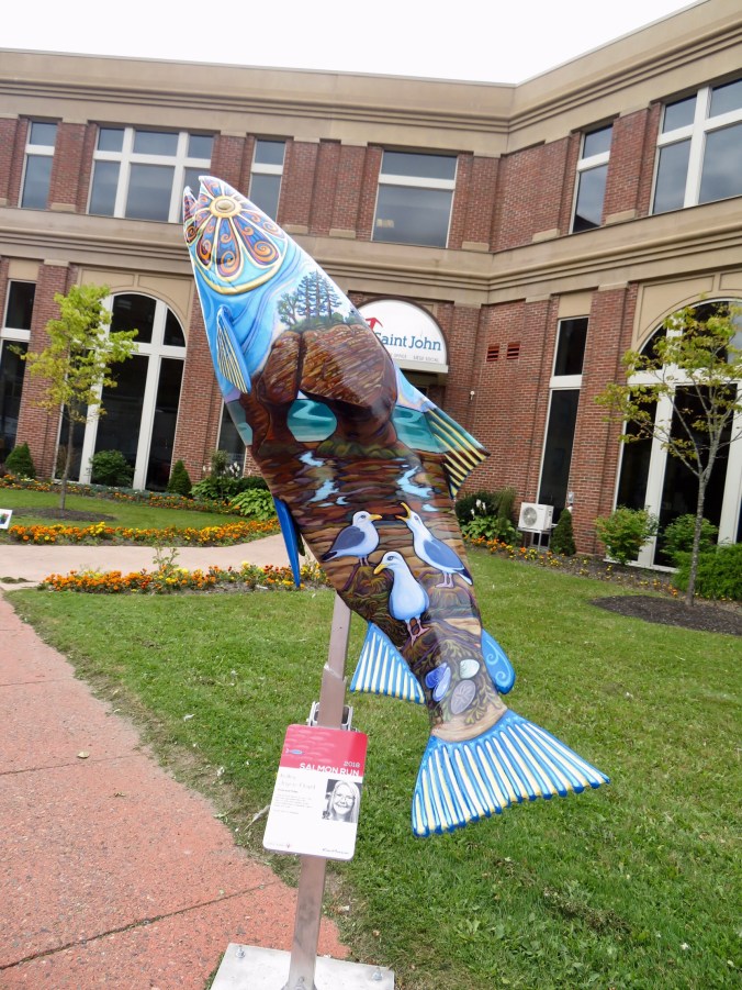 The people of Saint John have installed 10 different Salmon Run sculptures throughout the city, each one designed and painted by a different local artist.