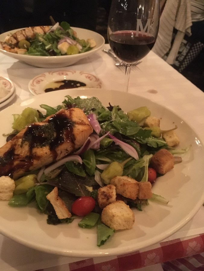Went to dinner at a great Italian place in the Original Farmer’s Market section of La Brea called Maggiano’s. Really good food, wine and wonderful service! We both had the Grilled Salmon Salad which was absolutely delicious.