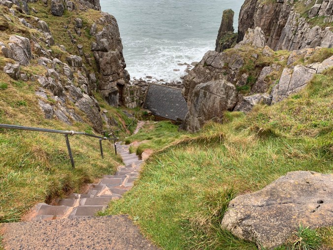 Off we went on the tiny one lane roads with 2 way traffic and pullouts every so often toward St. Govan’s Chapel which is on a military base and happened to be open for visiting today. St. Govan’s Chapel is amazing and well worth a visit if you are ever in the area and it is open. It costs nothing and neither does the parking. It’s a small chapel built on a cliff above the ocean. Entirely made of stone as are the steps leading down to it so “mind your step”.